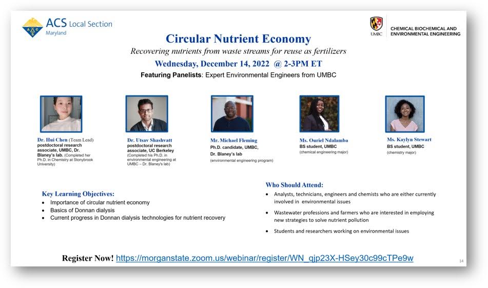 A collaborative effort between UMBC & ACS Maryland Local Section, this webinar focuses on environmental topics and promotes DEIR. The panel discussion coordinators were Professor Lee Blaney (UMBC) and Beatrice Salazar (ACS).