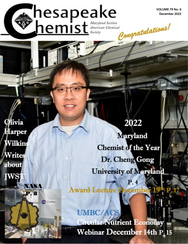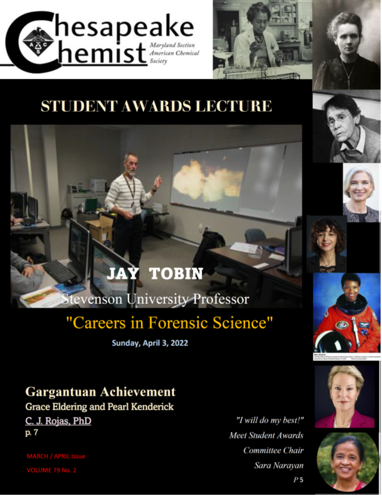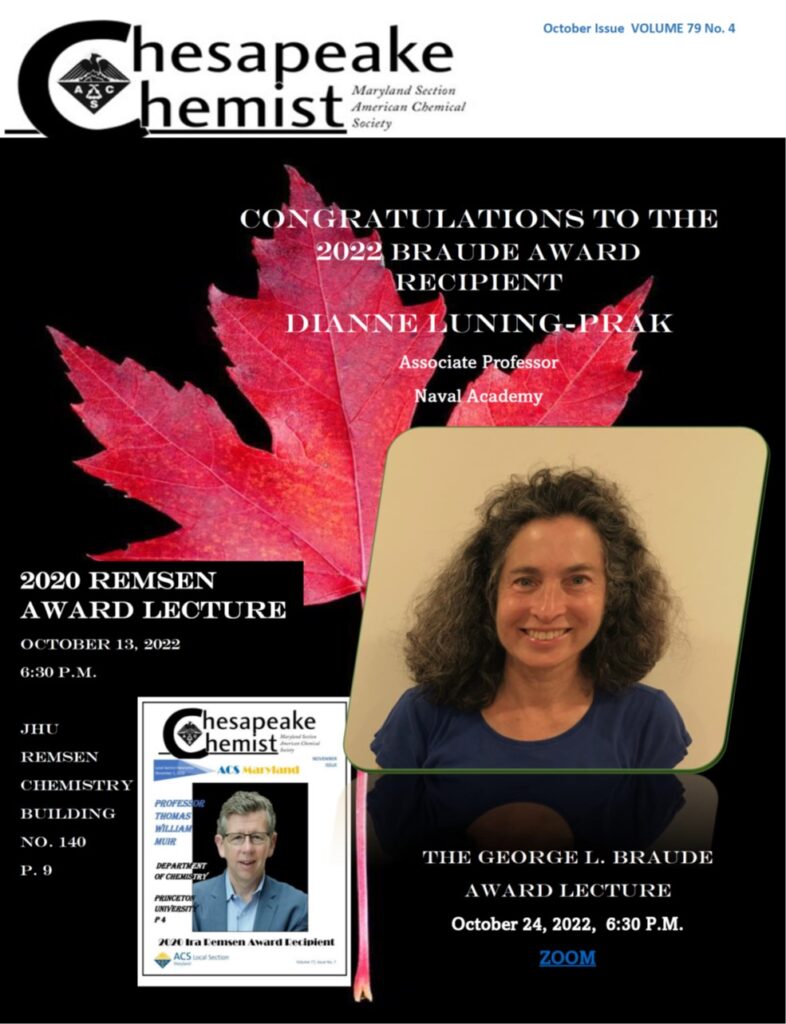 2022, Volume 79 Number 1: January/February WCC February Lecture Number 2: March/April Student Awards PowerPoint with student’ statements (click on student photos to hear them) Number 3: Summer-Issue/August USNCO-ACS Fall National Meeting Number 4: October 2022 Braude Award and 2020 Remsen Award Lecture see 2020 November Issue Number 5: November November Award Lecture Reports Remsen Award Lecture and Braude Lecture reports Number 6: December Maryland Chemist of the Year Award Lecture December 19, 2022